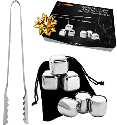 - NOVELTY GIFT FOR STOCKING STUFFERS - Your loved one opens the box and discovers this unusual present: an elegant glossy box that closes automatically, that contains 6 stainless steel ice cubes, 3 square ones usually for whiskey and 3 rounded ones usually for wine; plus tongs to handle them elegantly in the tumbler and a velvet storage bag. You will love to see their face of wonder. There is no other stainless steel whiskey ice cubes and wine pearls Gift Box like this one!