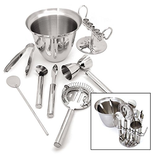 10 Piece Home Bar Set includes: 2 Prong Bar Strainer; Mixing Paddle; Bottle Opener; 6" Ice Tongs; 3/4 oz. x 1 1/4 oz. Jigger; Serrated Knife; Stainless Steel Ice Bucket.