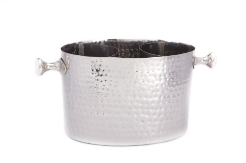 Keep your libations at the perfect temperature with this elegant hammered chrome 2 bottle chiller. 10¼"x7½"x7". Removable aluminum insertThis stylish cooler keeps two bottles of champagne or wine chilled during a dinner party or holiday celebration. The bucket is made of a heavier quality stainless steel with a hammered texture finish and measures 10 by 7-3/4 by 7 inches. Knobs are double-riveted onto each side of the chiller for easy lifting. A three-sectioned stainless-steel insert safely separates two bottles to prevent breakage and uses the middle section to hold extra ice between them. --Cristina Vaamonde