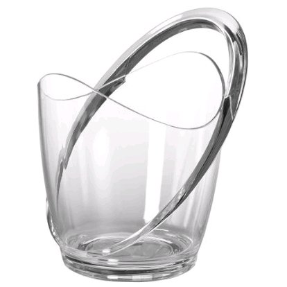The stylish lines of this attractive modern design will be the talk of the party. 'Molded-in' easy-to-carry handle adds an artistic flare. Made of crystal clear, break resistant acrylic the bucket is shipped bulk with color photo hang tag. Measures about 9" L x 8 " W x 10 " H.