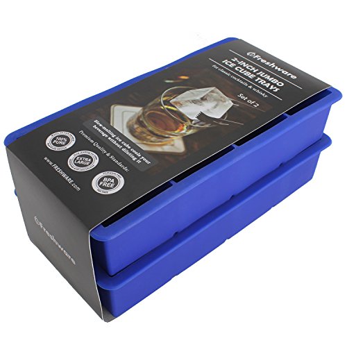 Keep cocktails, sodas, lemonade and iced tea perfectly chilled by pouring them over extra-large ice cubes made with the Freshware FI-112PK 8-Cavity Jumbo 2-Inch Cube Silicone Ice Tray, Blue, Set of 2. It is constructed with 100% pure, professional quality food-grade silicone, which meets US FDA safety standards (BPA, PVC and Phthalate FREE). The large surface area allows the ice to melt slower, letting your beverage to stay cooler longer without diluting the drink. Simply fill the molds with water or your favorite juice, fruits, herbs or citrus zest, freeze, and then pop out 8 fully-formed 2 inch jumbo ice cubes. Perfect for parties or events where you are going to serve cocktails, whiskey, tequila or vodka drinks. It is a must have for cocktail lovers, restaurants, bars, and home use. Our sturdy non-slip ice tray design will sit securely in the freezer without spilling a drop. Trays are also stackable to save valuable space. Ice cubes can be easily removed with a little twist and pus
