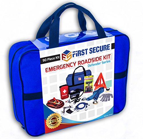 Before you buy it,You can read some features below,so you will know that this First Secure 90 Piece Roadside Emergency Car and Truck Kit with Safety Tools & Accessories Bag: Jumper Cables for Battery•Auto Air Compressor•First Aid•Tow Rope•Triangle•Flashlight are suitable with you .