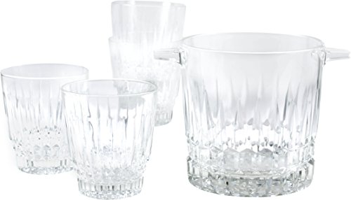 This beautiful glassware collection will serve you will and help set the right mood for all of your occasions. The whiskey set includes one ice bucket, one pair of tongs and four double old fashioned glasses. This Trevi collection is sculpted with care and made of crystal cut glass with elegant design.Ice bucket -- 5-1/2" diameter x 5-1/2" H; Glasses -- 3-1/2" diameter x 4" H, with an 8 ounce capacity; Tong -- 6-1/4" L x 1" W x 1" H