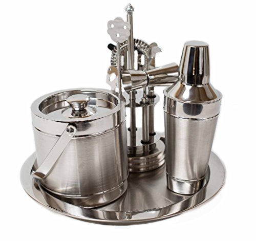 - Set Includes Double Walled Ice Bucket, Cocktail Shaker, Serving Tray, Cocktail Strainer, Bottle Opener, Jigger, Bar Spoon, Bar Knife, Tray