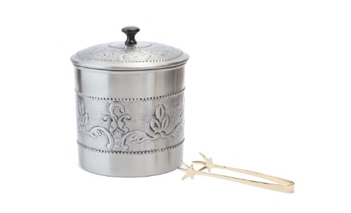 Hand-crafted metal is given an appealing vintage feeling in our "Victoria" Ice Bucket. Embossed by hand in a Fleur de Lis motif, this 3 Quart Ice Bucket has a rich, warm antique pewter finish. It's removable plastic Liner with draining plate keeps your ice cold and dry, while the included set of brass tongs make for easy ice retrieval.