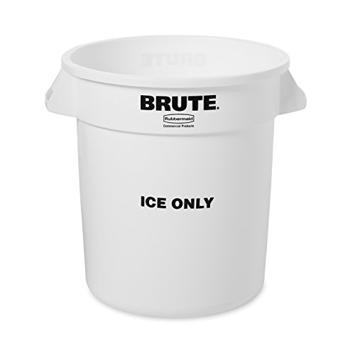 Rubbermaid Commercial Brute FG9F8600WHT 10-Gallon Linear Low-Density Polyethylene Ice-Only Container, White. For commercial, medical, and industrial use. Meets NSF and ANSI Standard 2 and 21 for use with meat and poultry equipment. Built-in, non-slip handles allow for nesting multiple containers without jamming when storing. For commercial, medical, and industrial use. Meets NSF and ANSI Standard 2 and 21 for use with meat and poultry equipment. It has a double-ribbed base for to make it more stable. Capacity: 10-gallon. 17-inch height by 16-inch diameter. BPA-free. Made in the USA